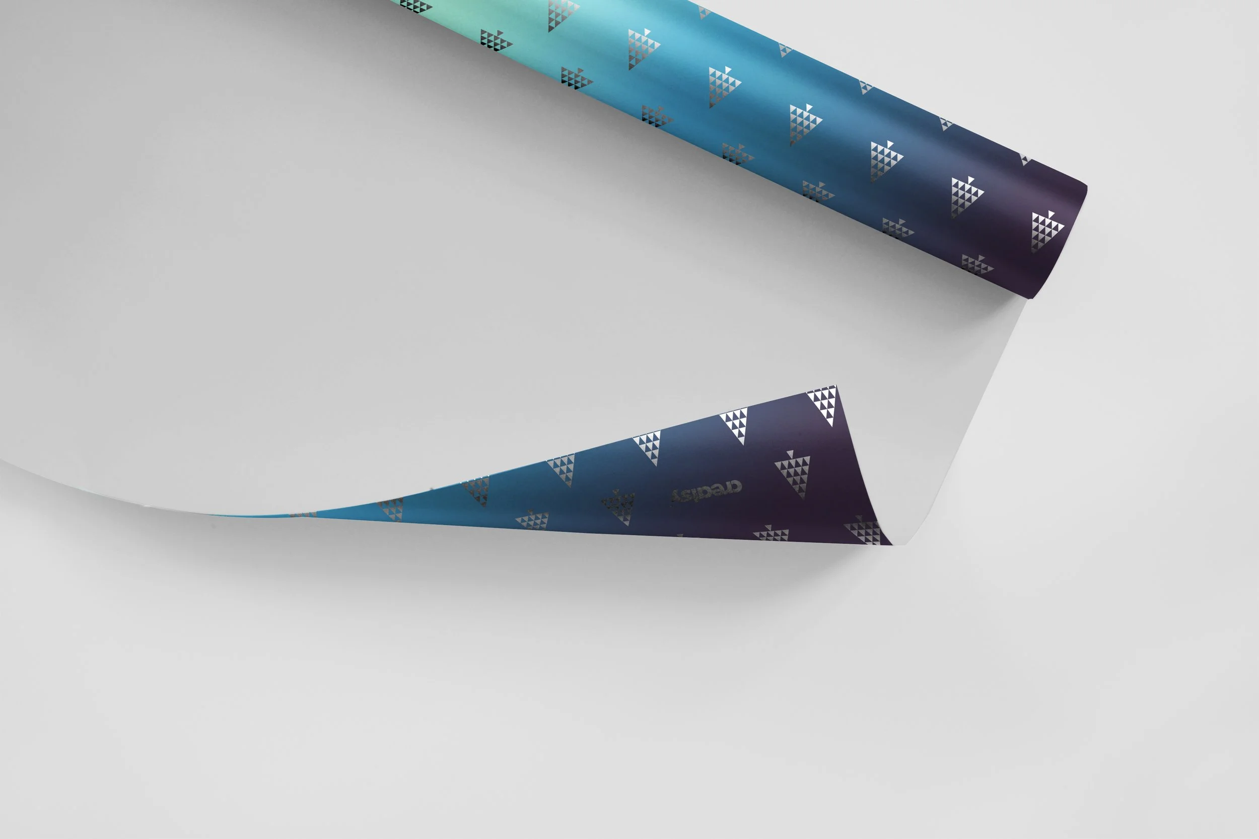 • Close-up of a rolled-up sheet with a geometric pattern of small triangles in shades of blue and purple on white background.