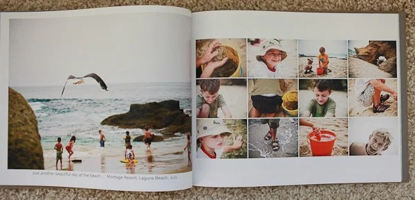 • Open photo album showing a beach scene on the left page with children playing and a bird flying overhead, and a collage of childhood photos on the right page including kids smiling, playing, and enjoying beach activities.