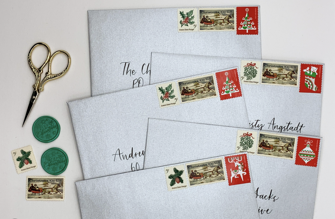 • Three white envelopes decorated with Christmas-themed postage stamps and address labels, gold scissors, and two green wax seals with holiday designs.
