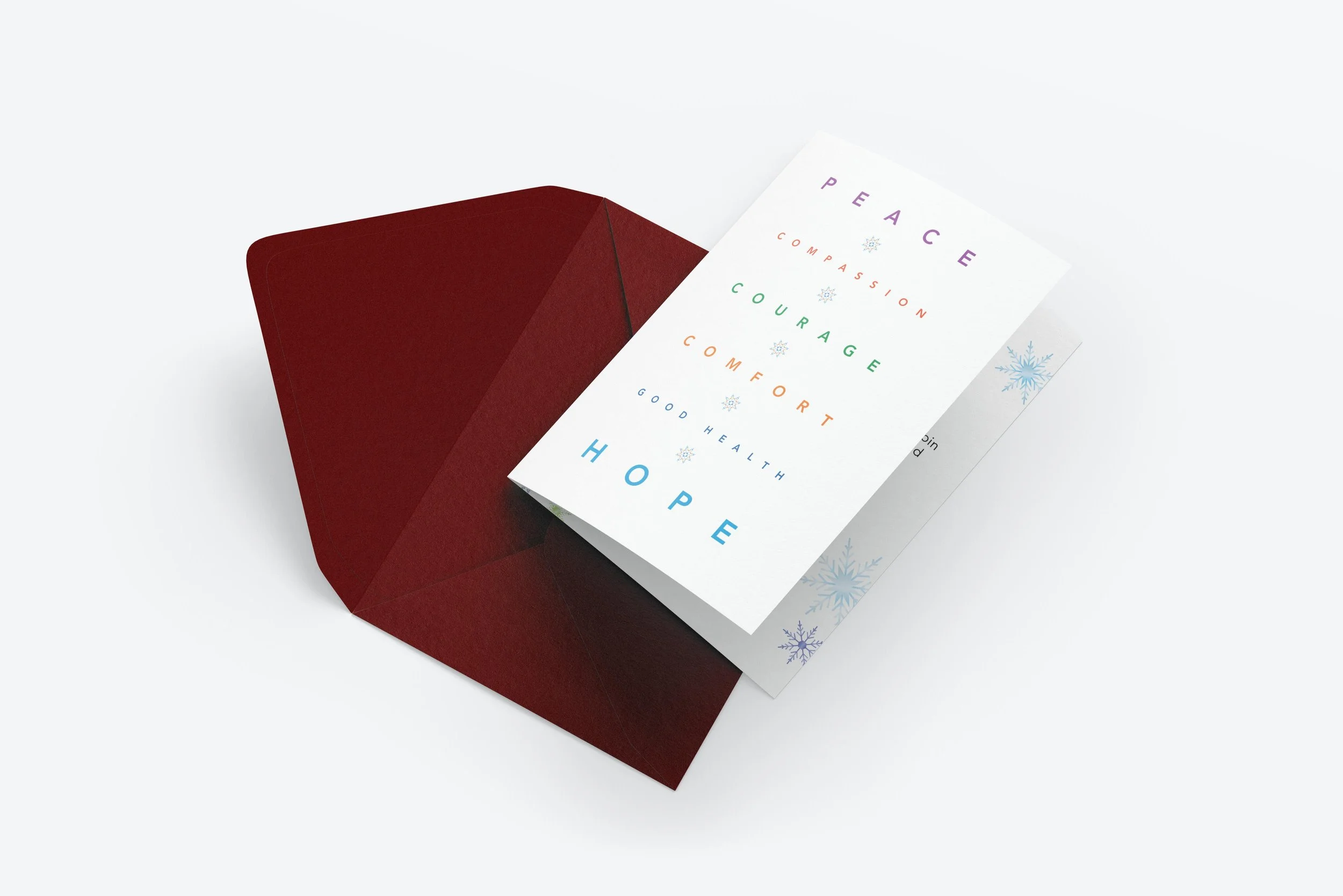• A red envelope containing a folded card with the words a a vertically arranged list of positive qualities in colorful text, including 'PEACE,' 'COMPASSION,' 'COURAGE,' 'COMFORT,' 'GOOD HEALTH,' and 'HOPE,' with small snowflake illustrations.